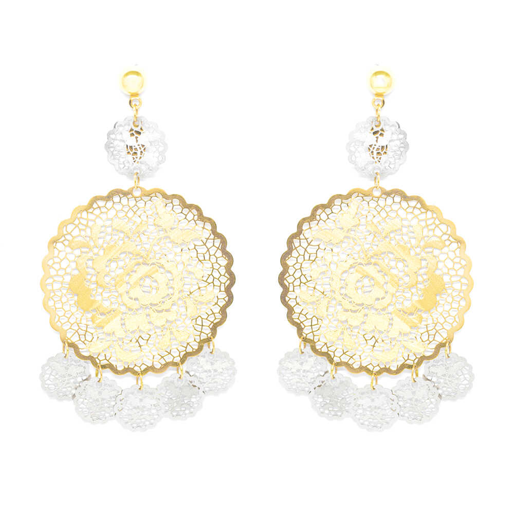 Gold chandelier earrings in two-tone gold with perforated details and ethnic design Ideal for bohemian chic looks.