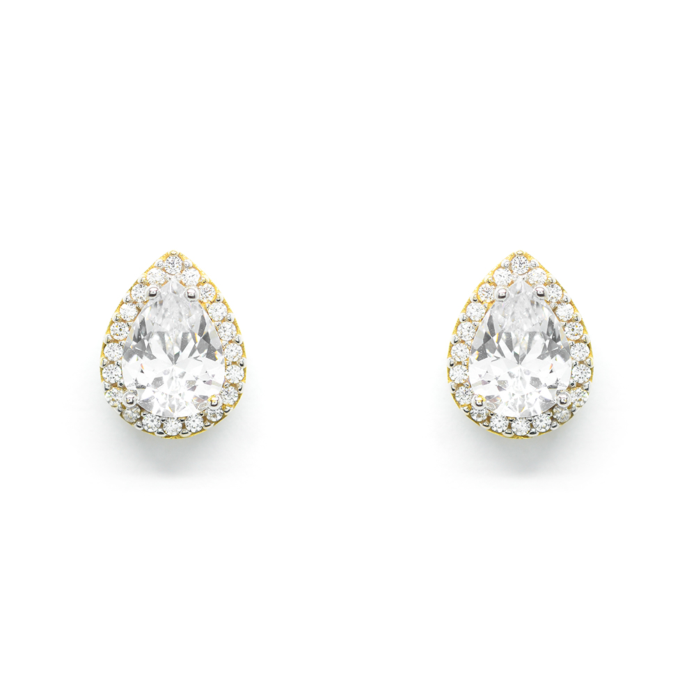 Earrings on the ear rosettes of yellow gold in an all time classic design and refined tear shape with zirgons in white color. Ideal for all day chic looks that will emphasize your elegant feminine side. Bridal collection