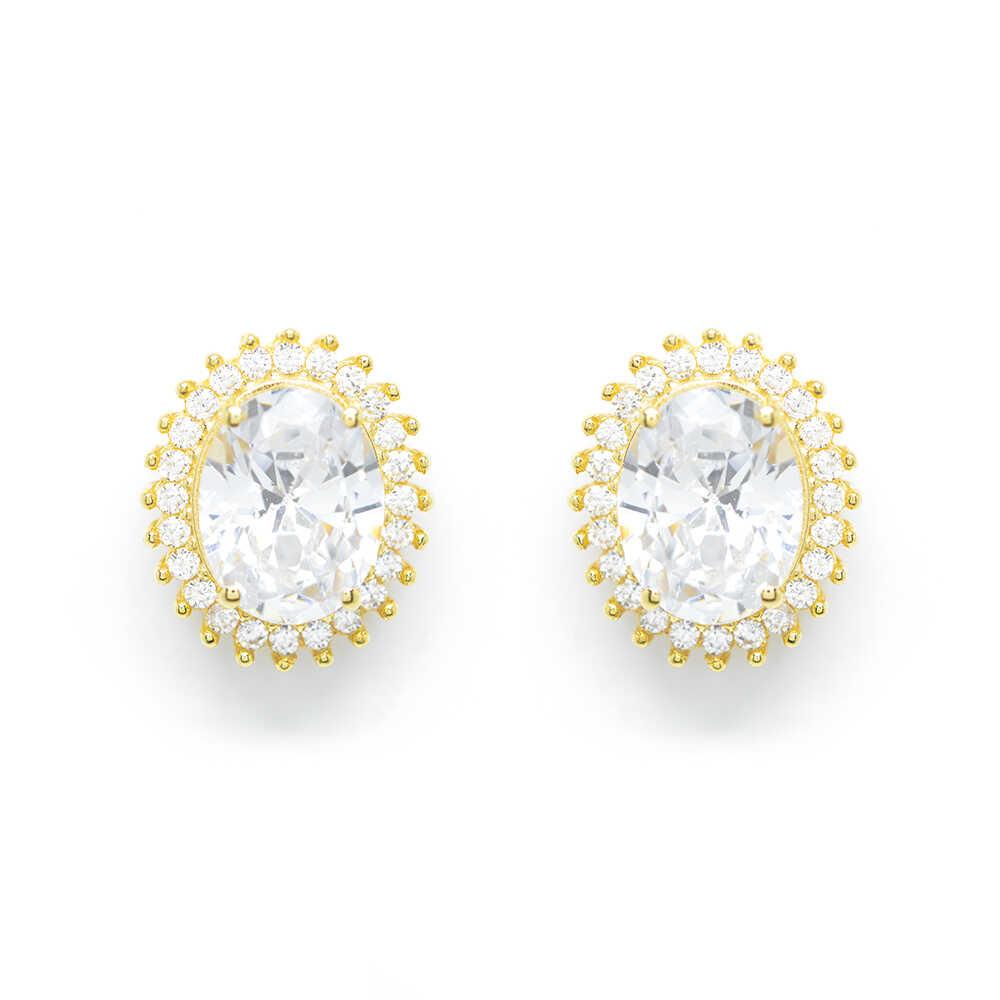 Earrings on the ear rosettes of yellow gold in an all time classic design and refined oval shape with white cubic zirgons. Ideal for all day chic looks. Bridal collection