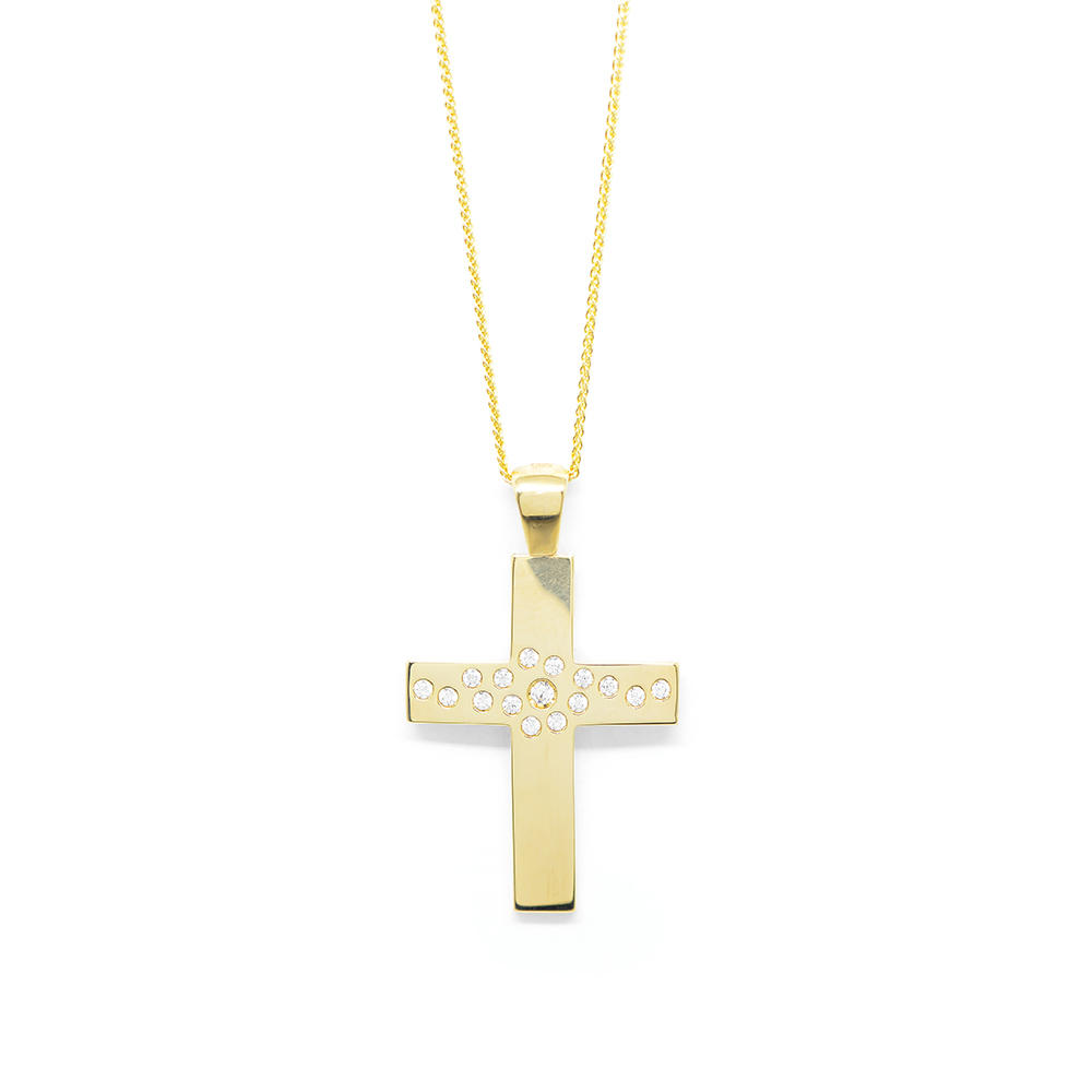 Shiny yellow gold cross in a geometric form and minimal aesthetics. A cross in a modern simple design with subtle details of cubic zirgons, ideal for baptism or for a woman.
