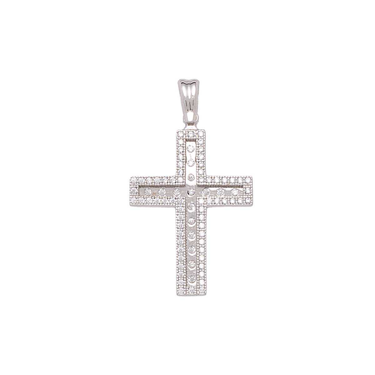 Cross made of white gold, shiny with shiny details in a row of studded cubic zirgons in a minimal chic design and uniquely exquisite craftsmanship. Also ideal for baptism.