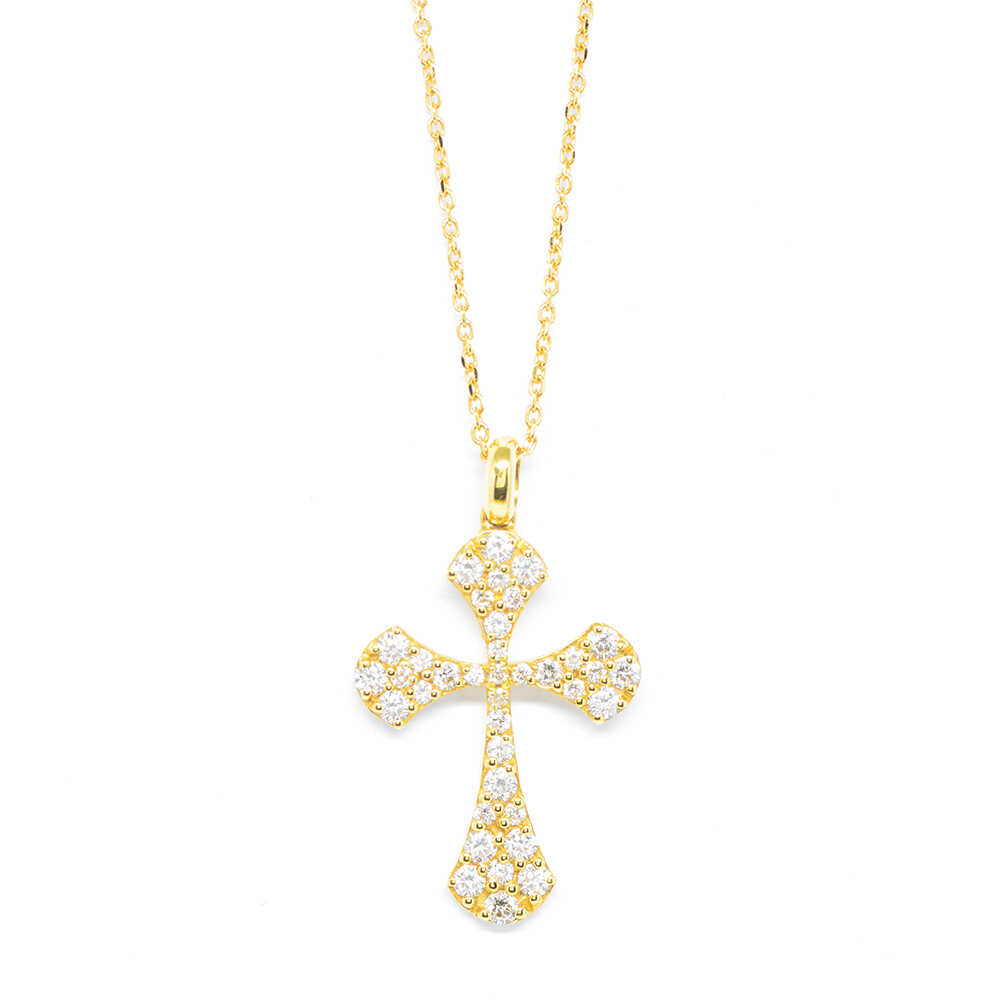Gold cross with brilliant cut diamonds in an all time classic design with pave studs and elegant aesthetics. Brilliants 0.44ct. Ideal for a woman and for a baptist