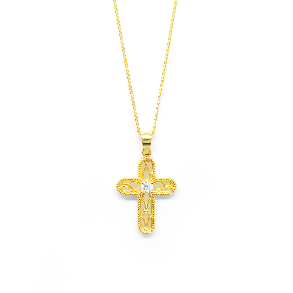 Cross gold uniquely polished in an exquisite style with sparkling details of cubic zirgons in a timeless line. It stands out for the wonderful impression thanks to the mirror technique. Ideal for a woman or for baptism.