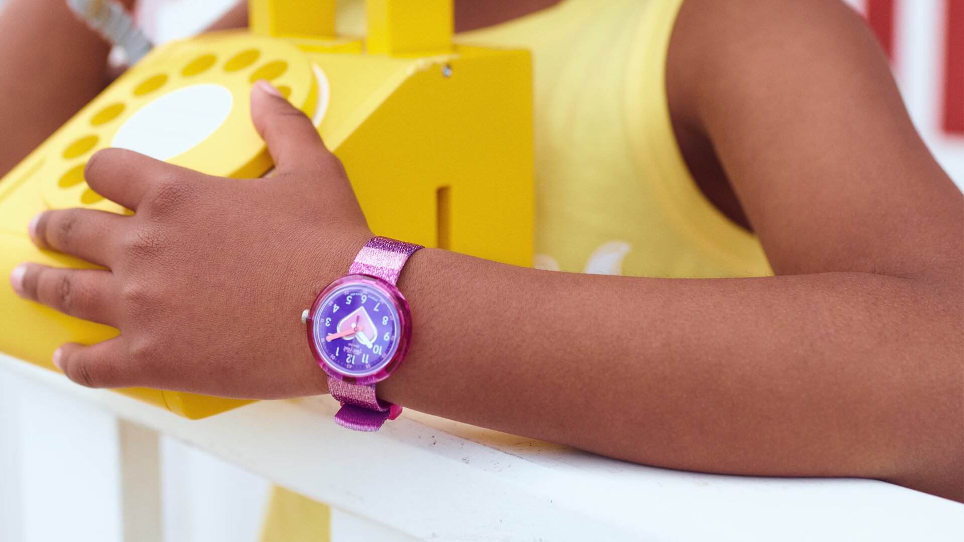 Kids will learn to tell time and sparkle brightly with the Stripy Glitter Clock! A chic and educational gift with a shiny strap and pink dial.