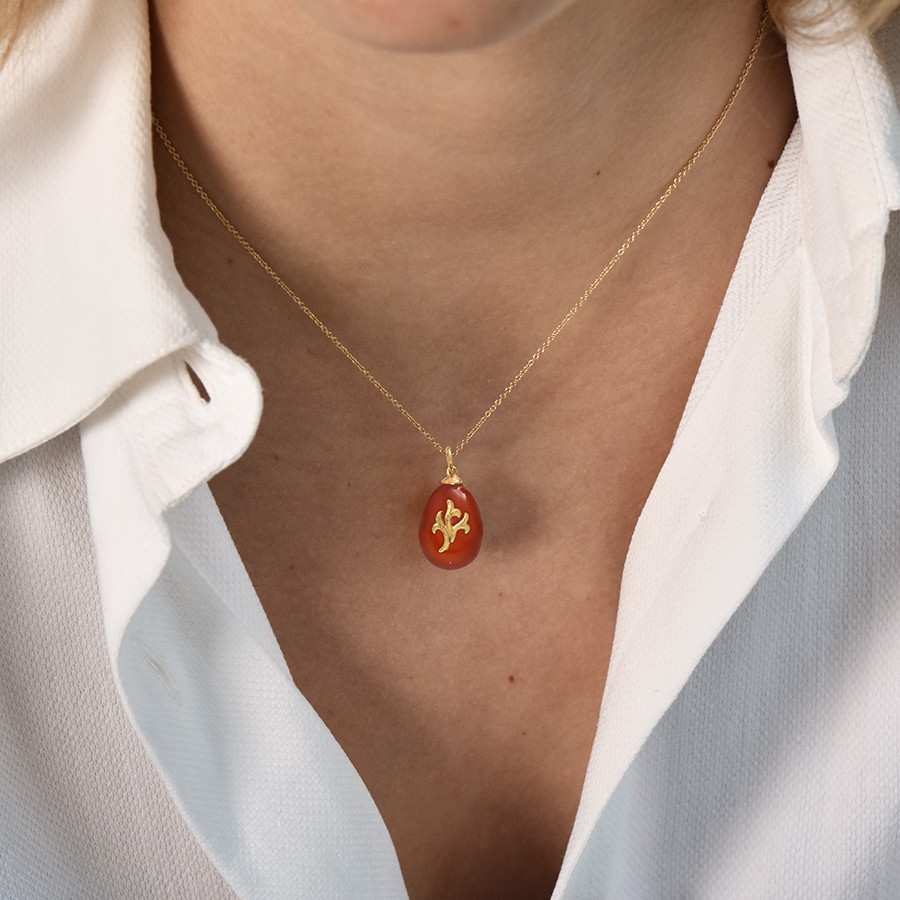 The egg shape is one of the purest and purest shapes in the environment. Eggs have different symbols depending on the cultures. Among other things, they symbolize creation, eternal life and new beginnings and are said to bring luck, purity and hope. Every year the Lalaounis house creates a new collection of the year's eggs. These pendants can be worn alone or in combination with other jewelry on a neck chain or link bracelet. Carnelian egg and 18K gold.