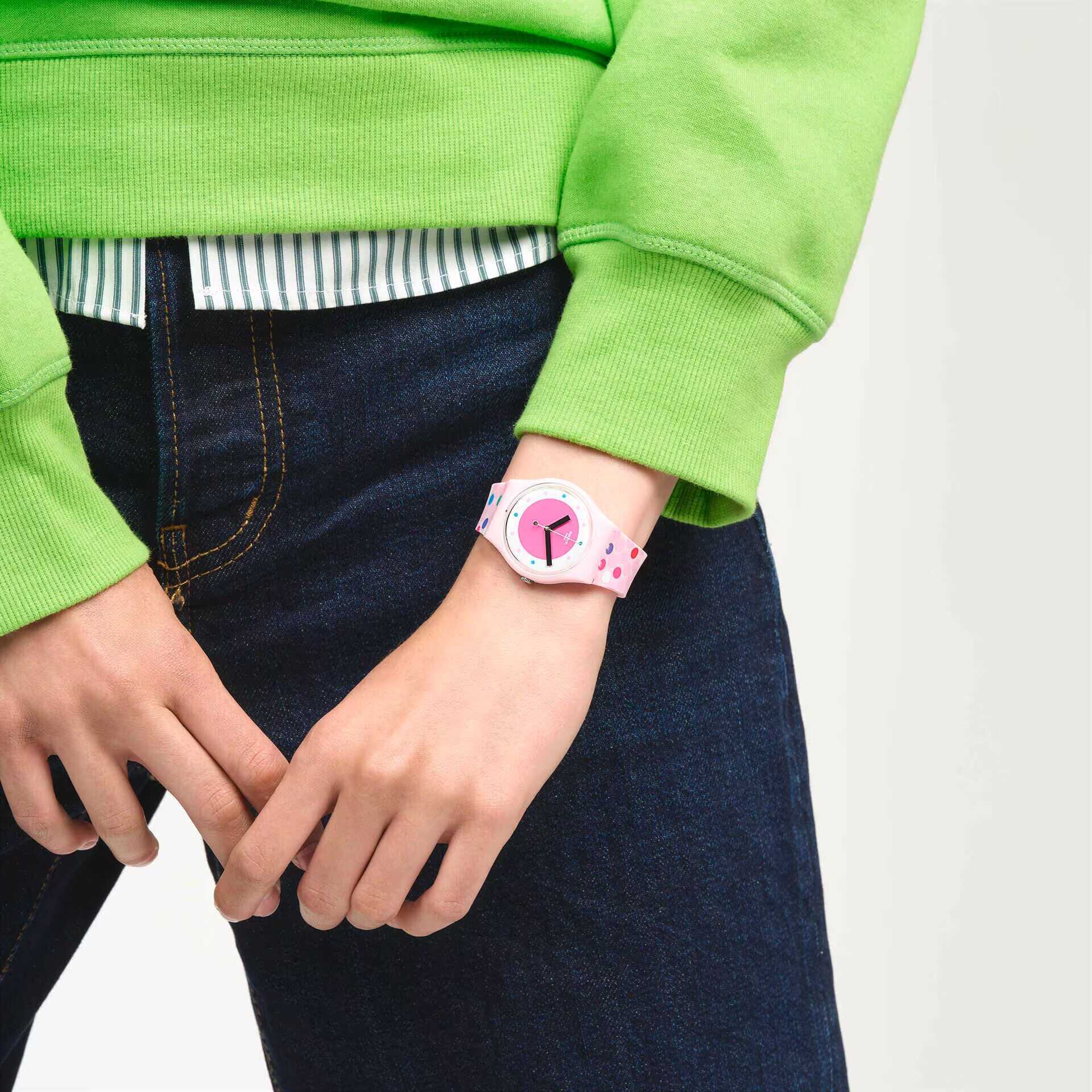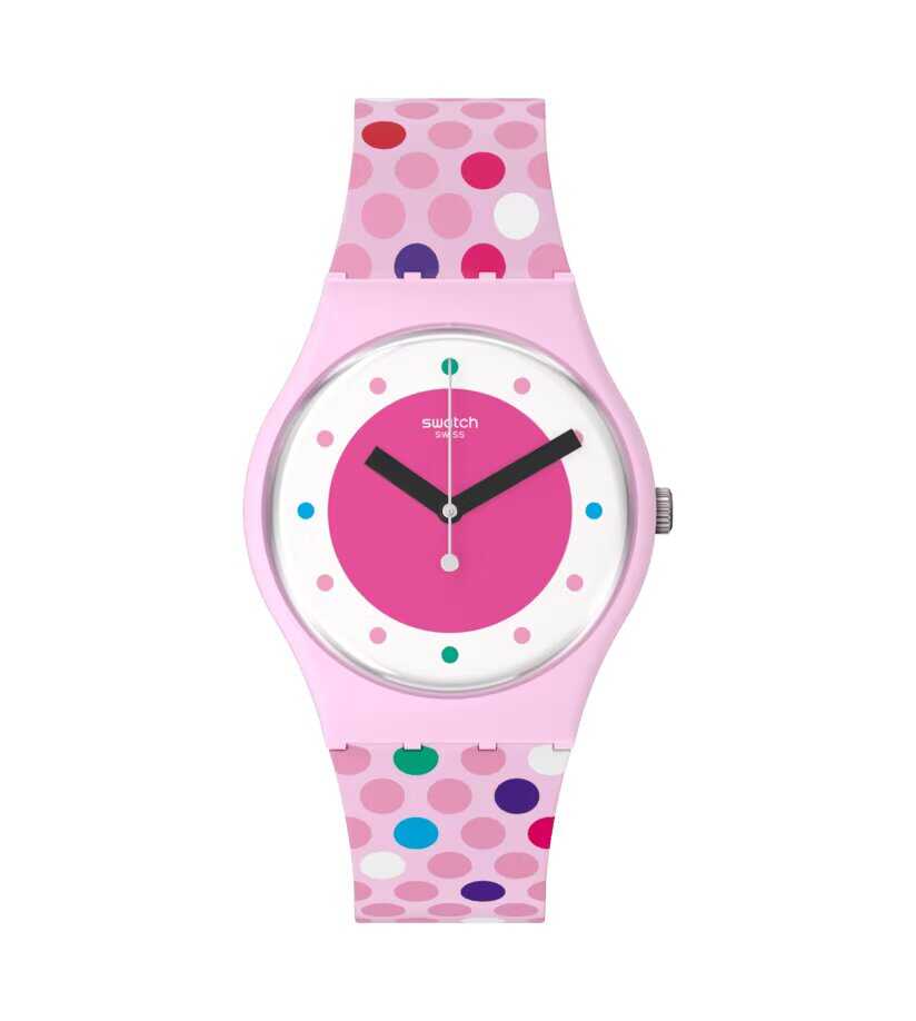 This playful polka dot watch has an organic pink case with a hot pink dial and organic glass with a matching pink print strap.