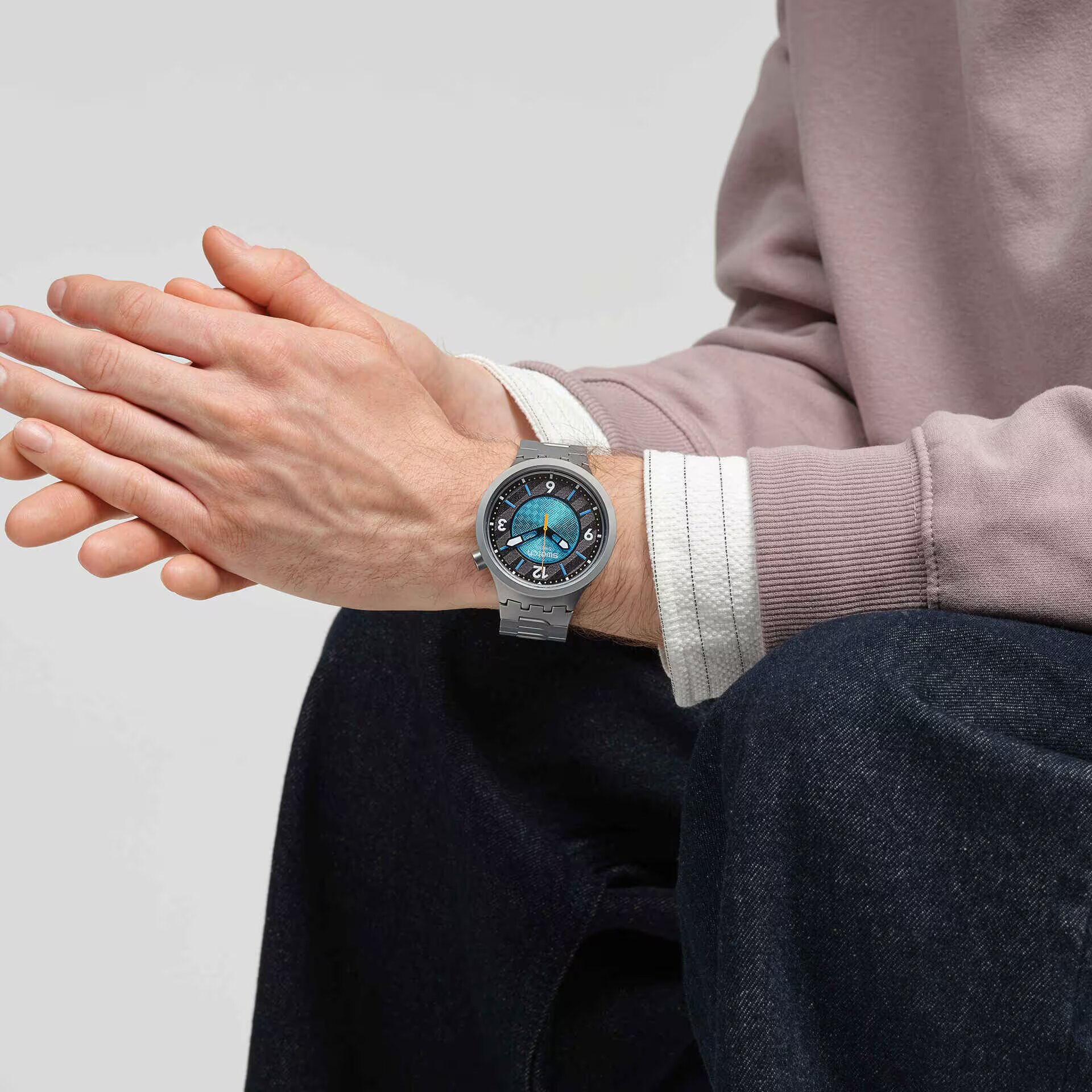 This large stainless steel watch features a black and blue dial with glow-in-the-dark numerals and hour markers and innovative 3D detailing. The sandblasted adjustable bracelet, stainless steel case and bezel complete the modern gorpcore look.