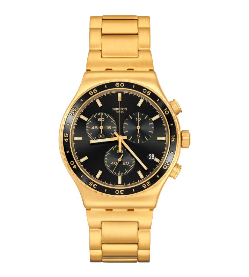 The black sun-brushed dial with gold hour and minute hands that glow in the dark and gold numerals give this chronograph a distinctive look. It features a brushed gold PVD case with a matching adjustable bracelet with a butterfly clasp.