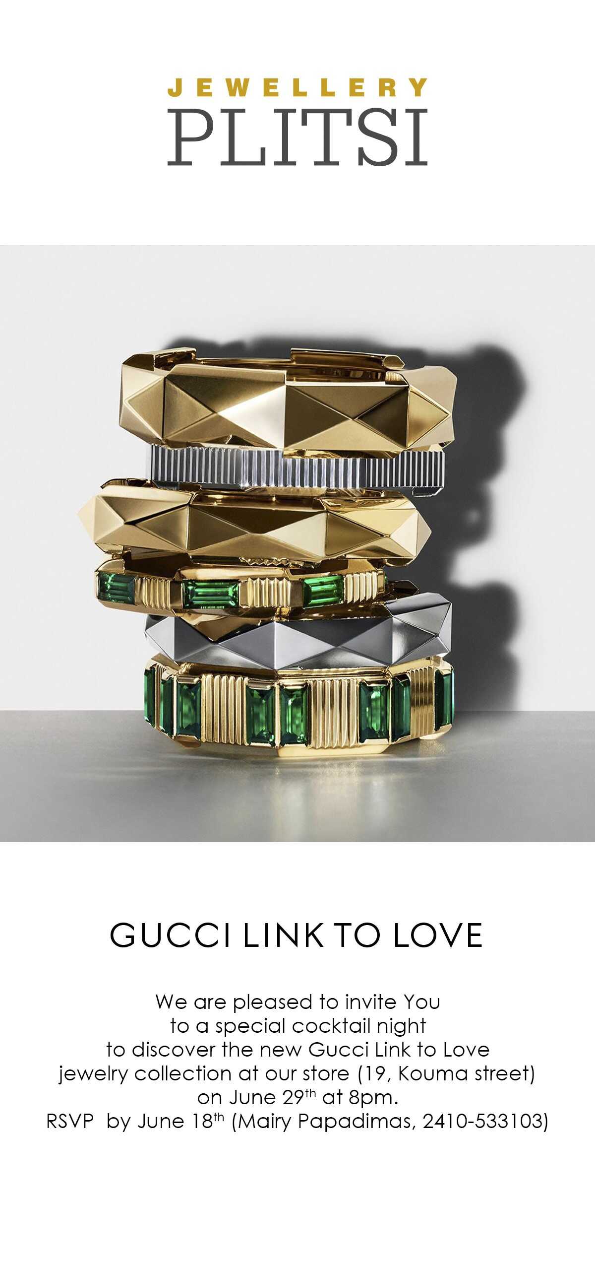 Το κοσμηματοπωλείο ΠΛΙΤΣΗ και ο οίκος GUCCI σας προσκαλούν σε μια αποκλειστική παρουσίαση της νέας high jewelry collection του οίκου και το γιορτάζουν το βράδυ της ΠΕΜΠΤΗΣ 26 ΙΟΥΝΙΟΥ με το πιο stylish coctail party του καλοκαιριού στον πεζόδρομο της οδού ΚΟΥΜΑ. Σας περιμένουμε όλους για να ανακαλύψετε την premium σειρά κοσμημάτων της GUCCI και να διασκεδάσετε με το live performance του ANTONIS DOMINOS.
