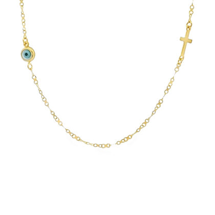 Κολλιέ elegant από κίτρινο χρυσό 14k με μάτι τυρκουάζ και σταυρό