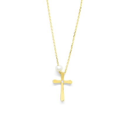 Κολλιέ elegant από κίτρινο χρυσό 14k με λαμπερό σταυρό και μαργαριτάρι