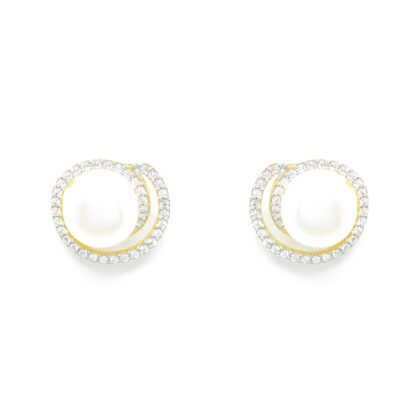 Σκουλαρίκια κομψά με μαργαριτάρι και zirgons από κίτρινο χρυσό 14k