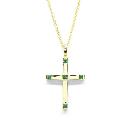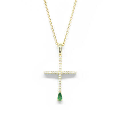 Σταυρός minimal από κίτρινο χρυσό 14k με πράσινα zirgons