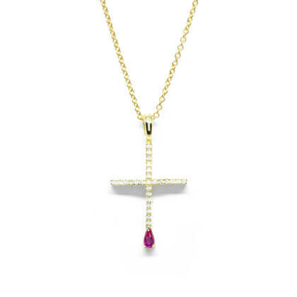 Σταυρός μοντέρνος από κίτρινο χρυσό 14k με λευκά και κόκκινα zirgons