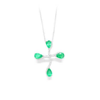 Κολλιέ με σταυρό από λευκόχρυσο 18k με διαμάντια και σμαράγδια