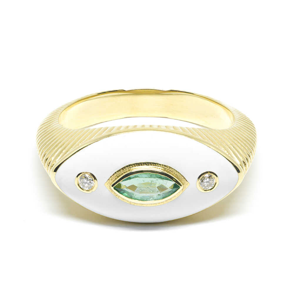 Δαχτυλίδι από Λευκό Σμάλτο ,Διαμάντια και Σμαράγδι navette Evil Eye