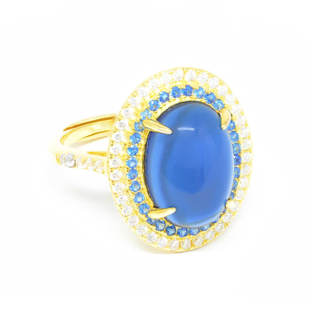 Δαχτυλίδι από ασήμι σε σχέδιο ροζέτα με επιχρύσωση από κίτρινο χρυσό 18k, cubic zirgons κι εντυπωσιακό oval κέντρο σε αριστοκρατικό μπλε χρώμα . Ένα υπέροχο κόσμημα για elegant εμφανίσεις.
