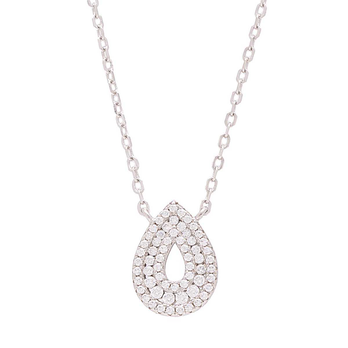Κολλιέ από ασήμι με ροζέτα σε σχήμα σταγόνας ”drop shape” από cubic zirgon και επιπλατίνωση από λευκό χρυσό Κ18. Ένα κόσμημα με μοναδική λάμψη για εκλεπτυσμένες και ξεχωριστές εμφανίσεις .