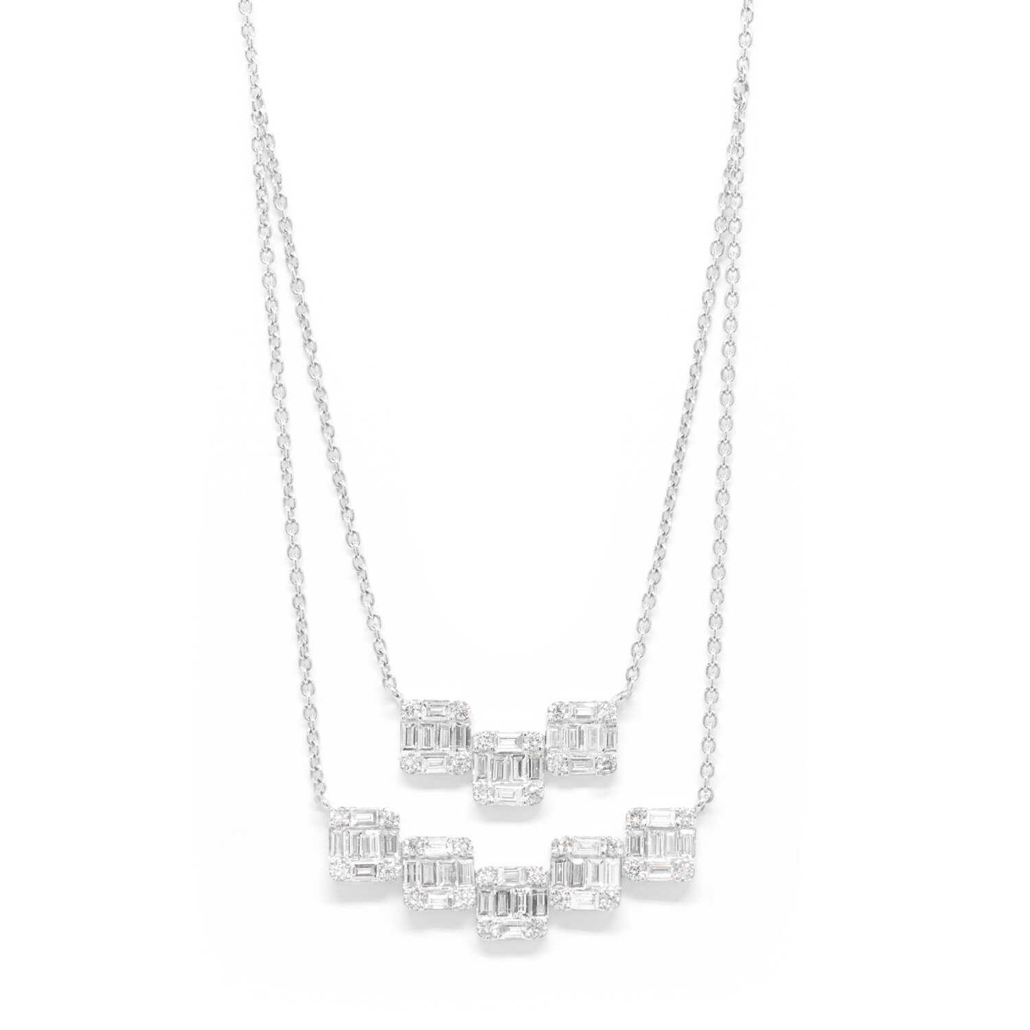 Κολλιέ από λευκόχρυσό Κ18 σε αριστοκρατικό σχεδιασμό με μοτίβο με διαμάντια κοπής brilliant και baquettes. Ένα περιδέραιο παντοτινής λάμψης και αξίας ιδανικό για elegant chic εμφανίσεις. Brilliants’ total 3.20ct.