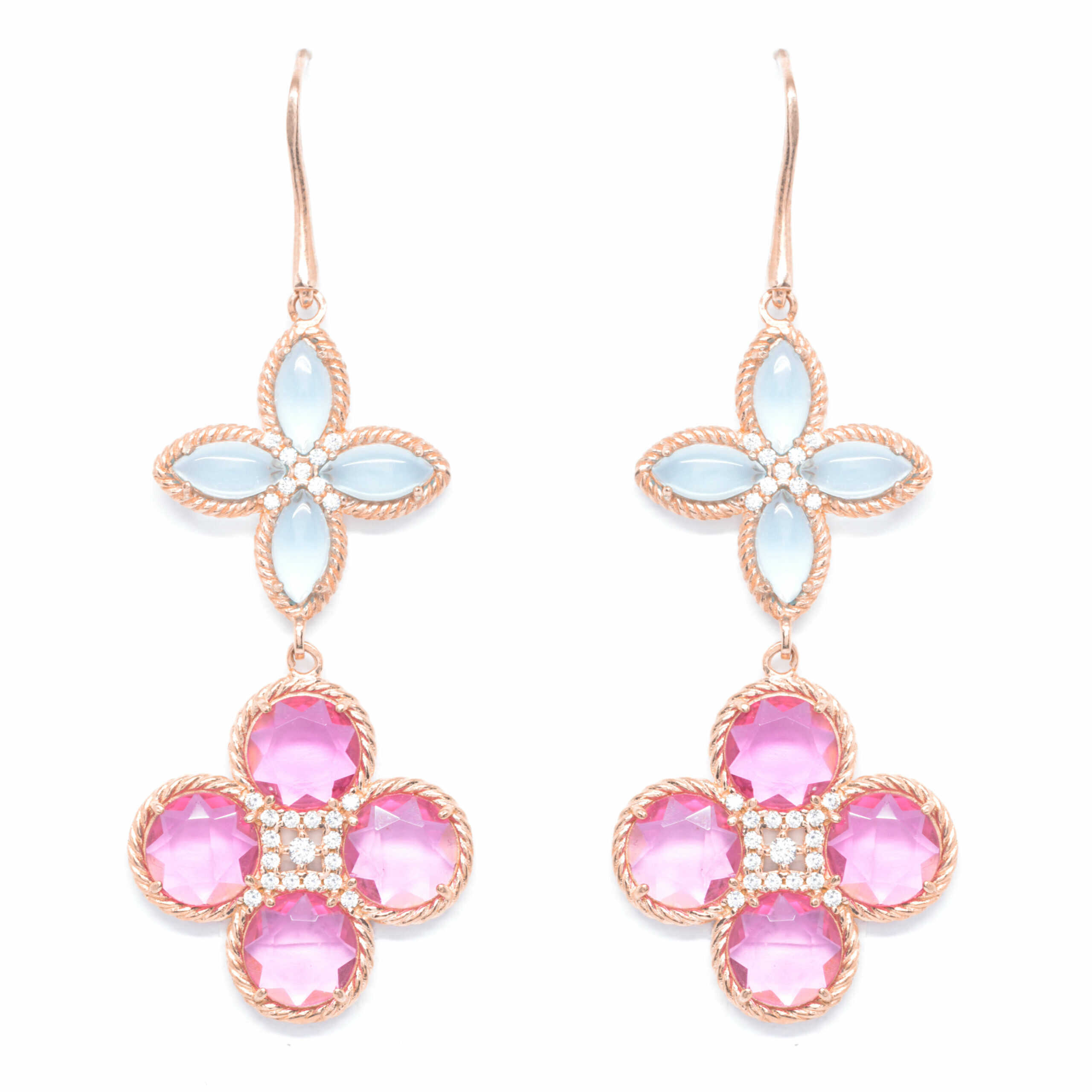 Σκουλαρίκια απο ασήμι 925 σε ροζ επιχρύσωση Κ18 με εξαιρετικά μοτίφ από crystal quartz σε ροζ και στην απόχρωση της acquamarine χαρίζοντας εκλεπτυσμένο ύφος και θηλυκότητα . Ιδανικό για all day chic εμφανίσεις.