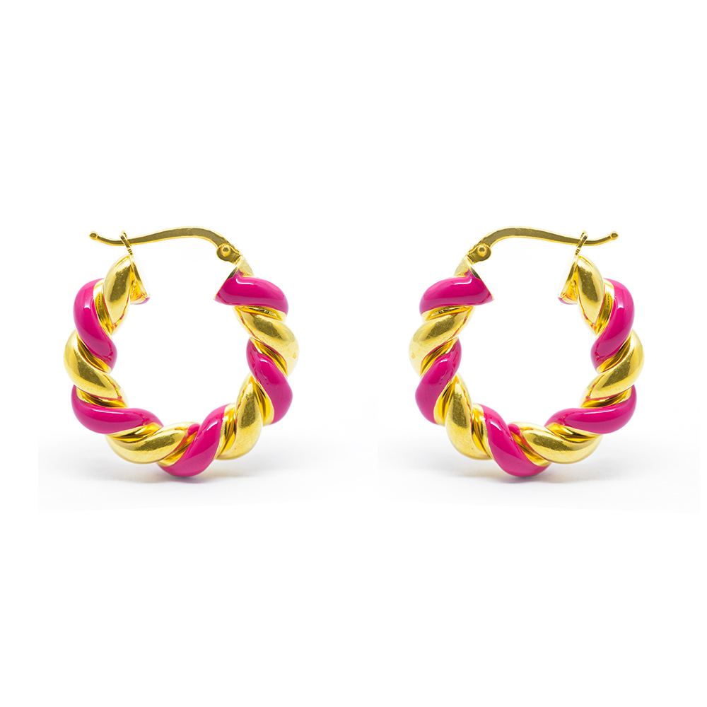 Σκουλαρίκια κρίκοι Χρυσοί στριφτοί με ροζ σμάλτο
