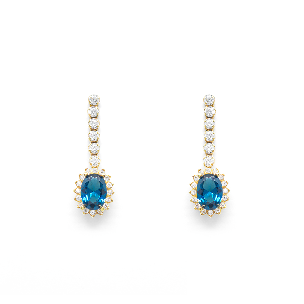 Σκουλαρίκια ροζέτες με μπλέ oval zirgon από κίτρινο χρυσό 14k