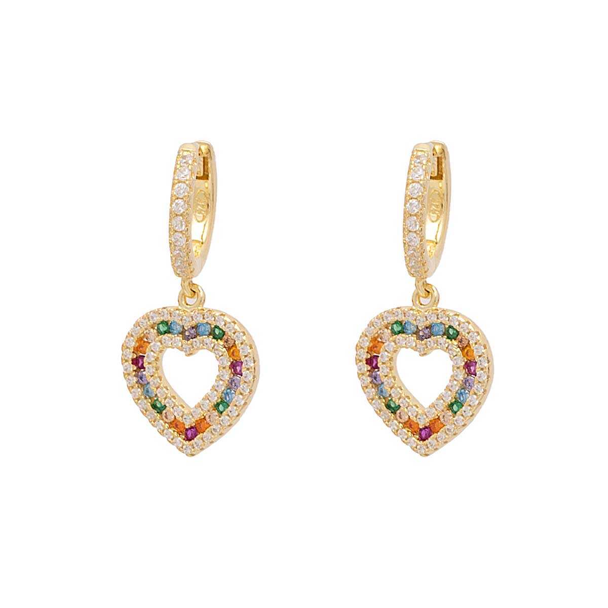 Σκουλαρίκια ασημένια huggies σε elegant σχεδιασμό με έντονα παιχνιδιάρικη διάθεση χάρη στα rainbow cubic zirgons και επιχρύσωση από κίτρινο χρυσό Κ18. Ένα girly κόσμημα με μοναδικές λάμψεις για urban chic εμφανίσεις.