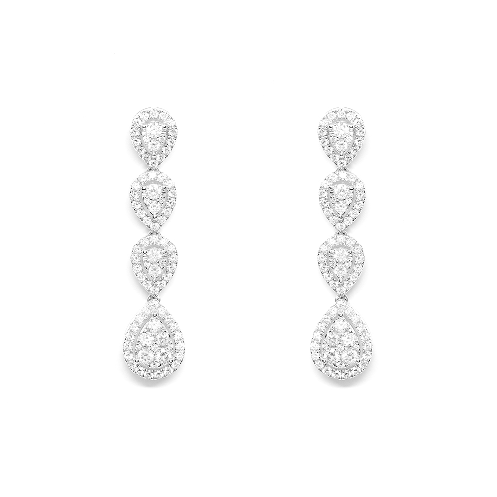 Σκουλαρίκια διαμαντένια κρεμαστά με ροζέτες σε oval και pear shape τελείωμα από λευκόχρυσο Κ18 με διαμάντια κοπής brilliant σε αριστοκρατικό ύφος.Ένα ζευγάρι σκουλαρίκια παντοτινής αξίας για εκθαμβωτικές και διαχρονικά κομψές εμφανίσεις. Diamonds total 2.20ct Wedding Collection