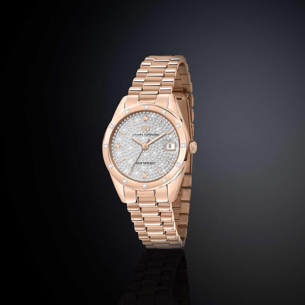 Γυναικείο ρολόι CHIARA FERRAGNI EVERYDAY διαμέτρου 32mm, με μηχανισμό QUARTZ ακριβείας, ροζ επίχρυσο καντράν, κάσα και μπρασελέ από ανοξείδωτο ατσάλι.