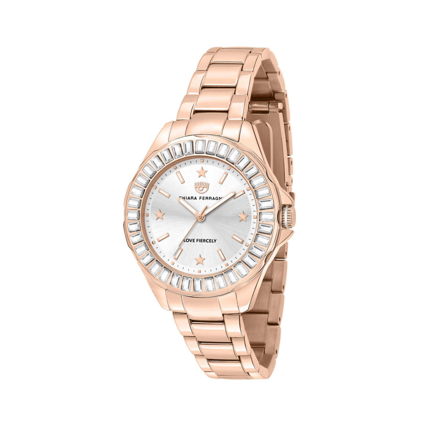 Η συλλογή ρολογιών της CHIARA FERRAGNI αποτελείται από τέσσερις σειρές δημιουργώντας το απόλυτο fashion statement αξεσουάρ. Διάλεξε το μοντέλο που σου ταιριάζει για να εκφράσεις το προσωπικό σου ύφος ανάλογα με τη διάθεση και το στυλ που σε χαρακτηρίζει. Γυναικείο ρολόι με ασημί καντράν, μπρασελέ από ατσάλι σε ροζ χρυσό και στεφάνη στολισμένη με διάφανες πέτρες.