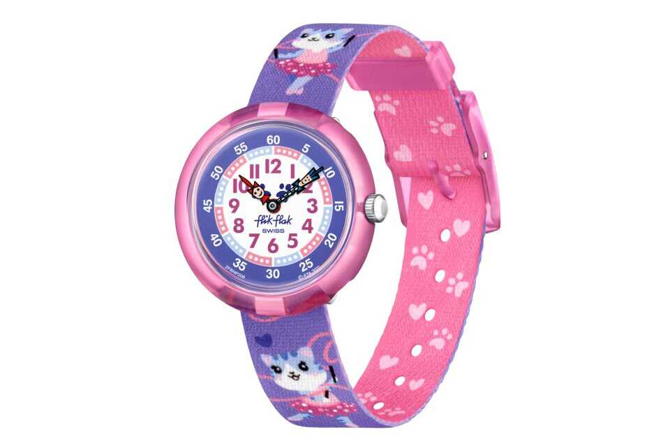 Πατουσάκια και γατάκια στο ροζ και μοβ ρολόι για παιδιά BALLERICHAT. Ένα εκπαιδευτικό δώρο για τους μικρούς χορευτές που μαθαίνουν να λένε την ώρα.