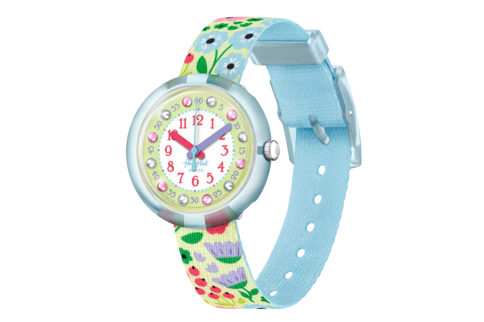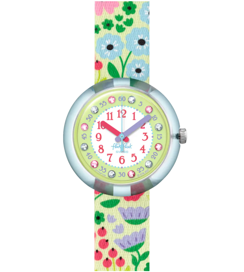 Η άνοιξη φτάνει! Χαρούμενα ροζ και μπλε λουλούδια με αστραφτερή λάμψη στο εκπαιδευτικό ρολόι για παιδιά. Ένα δώρο για την εκμάθηση της ώρας.
