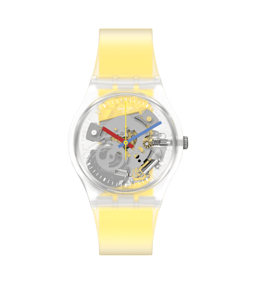 Αυτό το διαφανές ρολόι διαθέτει διαφανή πλαστική κάσα με κίτρινη εκτύπωση στην πλάτη και ταιριαστό λουράκι σιλικόνης. Το διαφανές καντράν διαθέτει λευκές τυπωμένες ενδείξεις και ξεχωρίζει με τους δείκτες σε κόκκινο, μπλε και κίτρινο.
